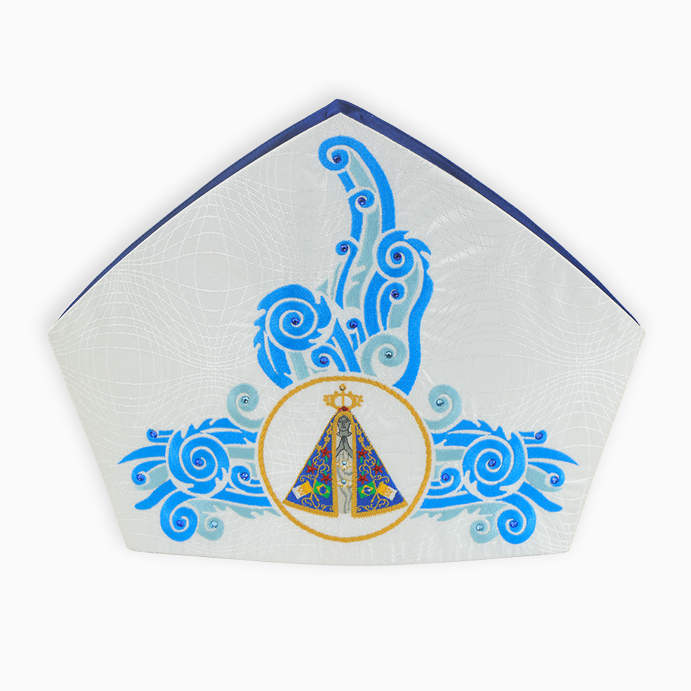 Quando falamos da mitra mariana, falamos de uma peça que se reveste de simbologia particular. Usada em celebrações dedicadas à Virgem Maria, essa mitra frequentemente incorpora elementos iconográficos associados à Mãe de Deus, como o monograma "M" ou imagens que remetem à sua pureza e maternidade. Essa peça reforça a reverência a Maria ao mesmo tempo em que mantém a dignidade episcopal própria da mitra.